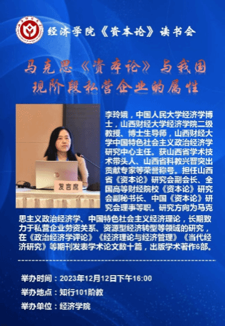 李玲娥老师为读书会作了题为“马克思《资本论》与我国现阶段私营企业的属性”的专题讲座。李玲娥老师首先带领大家一起回顾了马克思《资本论》中关于资本主义私营企业性质的论述及其方法论意义,指出马克思的历史唯物主义和唯物辩证法是我们认识我国现阶段私营企业性质的方法论基础。其次,李玲娥老师从我国现阶段私营企业、私营企业主、私营企业劳动者以及私营企业劳资关系四个方面向大家介绍了我国现阶段私营企业二重性的表现及特征。最后,李玲娥老师在理论分析和现实分析的基础上,引导大家认识到应该客观地看待我国现阶段私营企业的本质属性,公正地评价现阶段私营企业在发展生产力及社会经济中的积极作用。